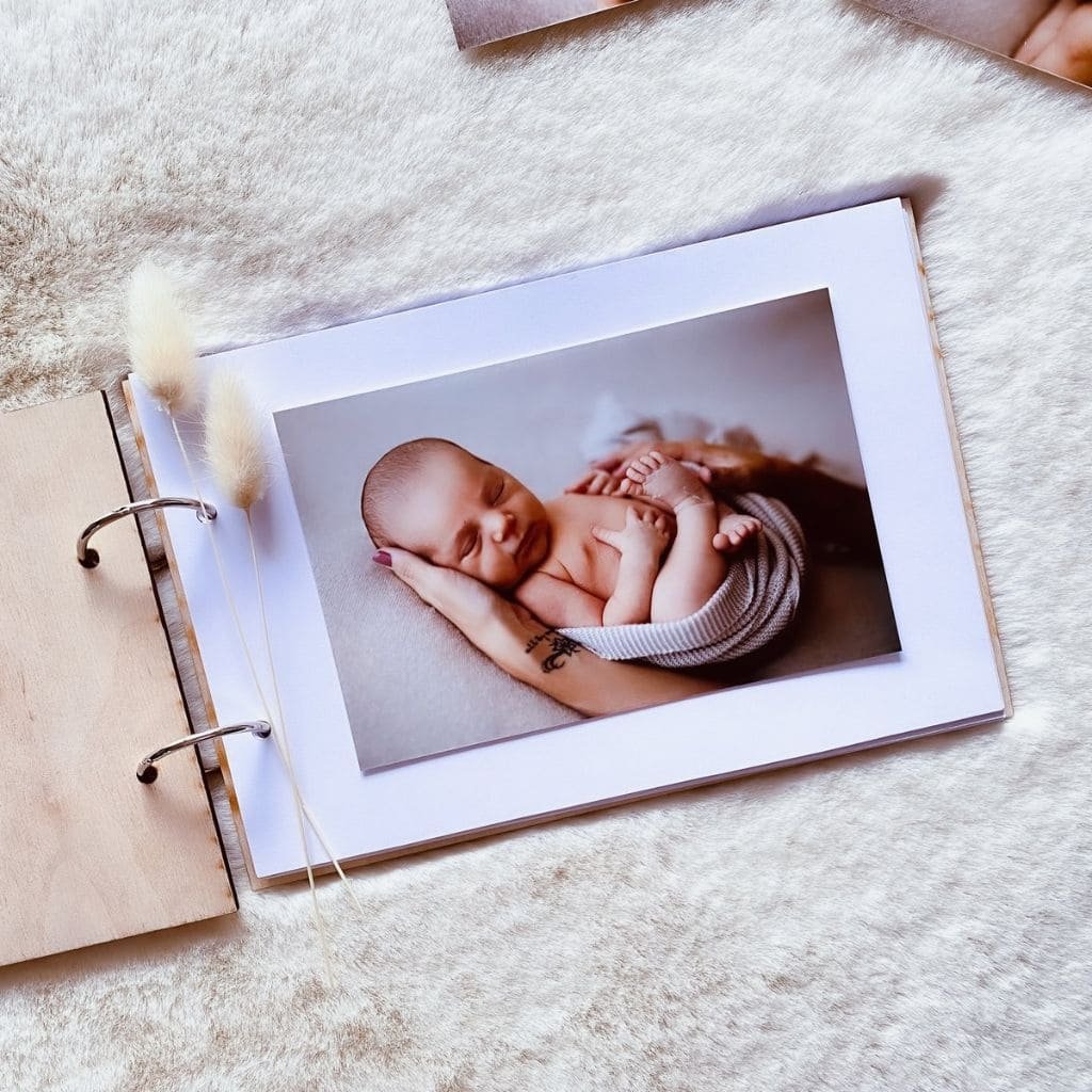 Regálales nuestro álbum de fotos de madera personalizado con el nombre del bebé.
