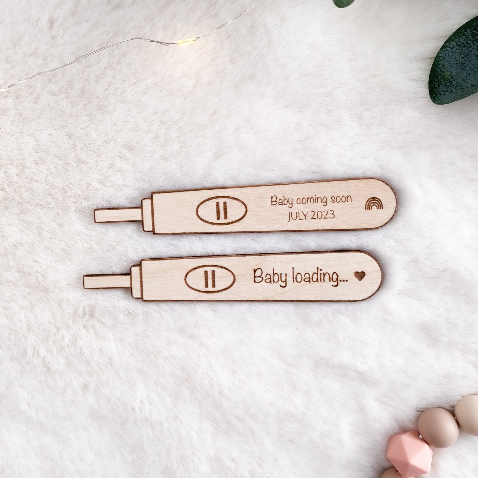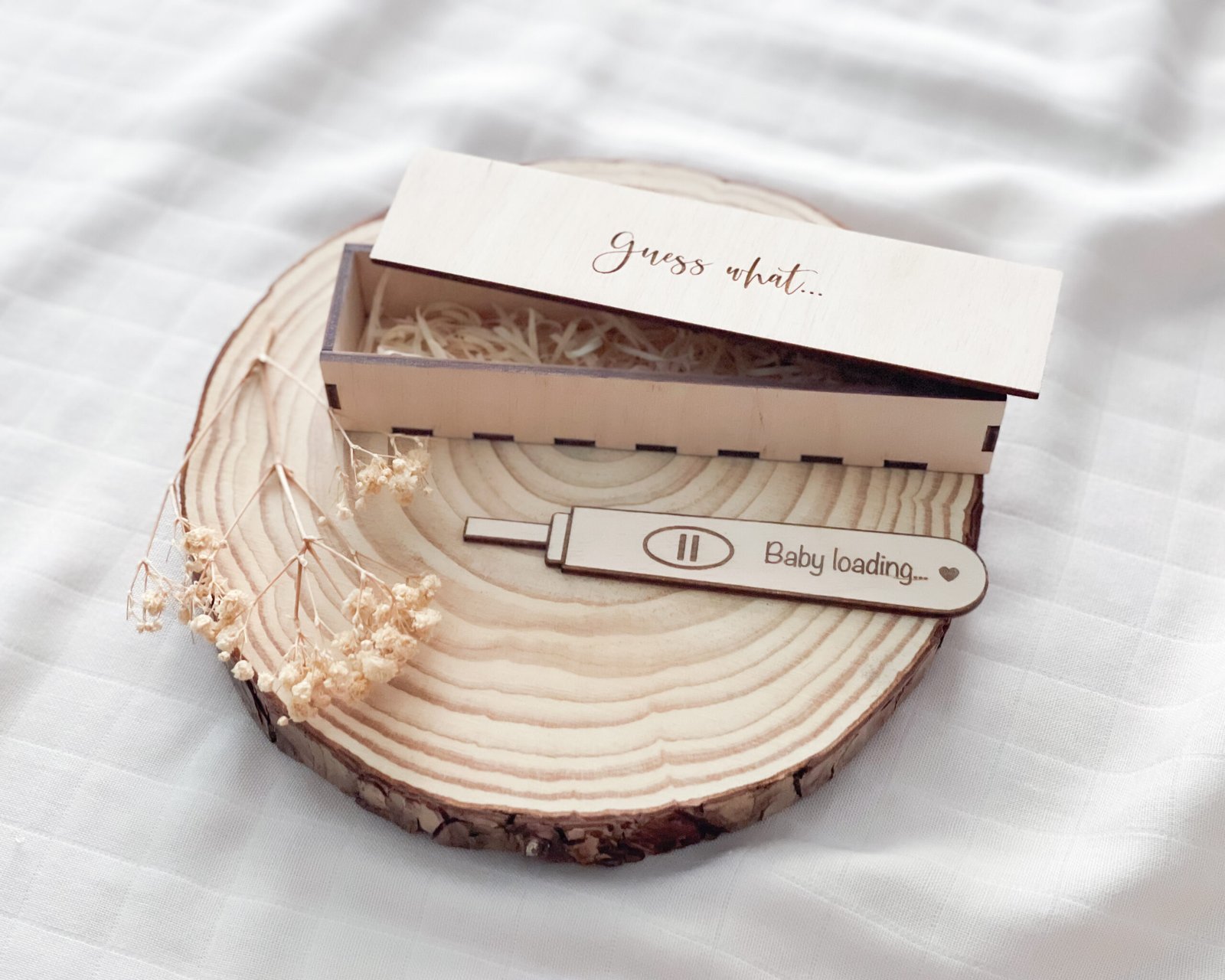 Caja con test de embarazo de madera para sorprender a tus seres queridos de una forma especial, única y que podrán atesorar para siempre.