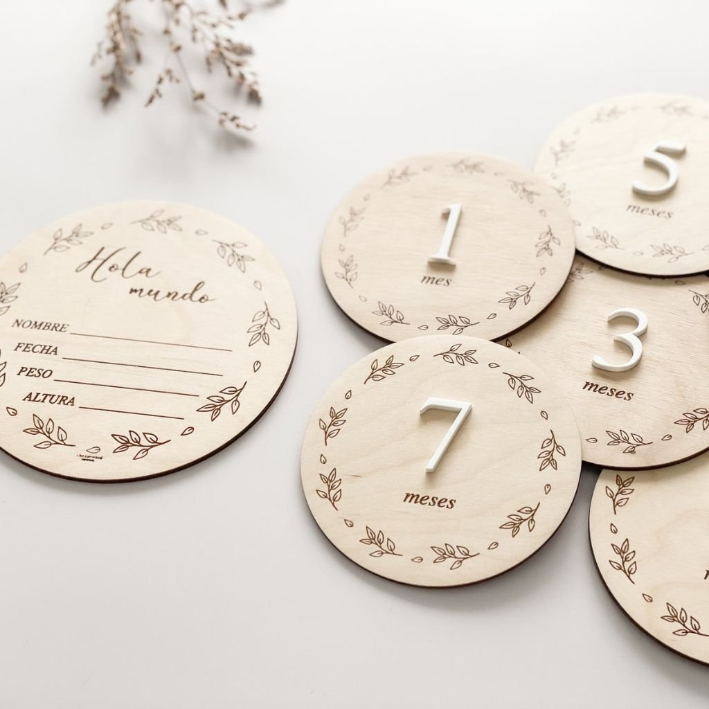 Pack cumplemes compuesto por 7 discos de madera grabados por ambas caras con el mes en acrílico blanco y un disco extra con el nombre del bebé y los detalles de nacimiento que podrás escribir a mano.