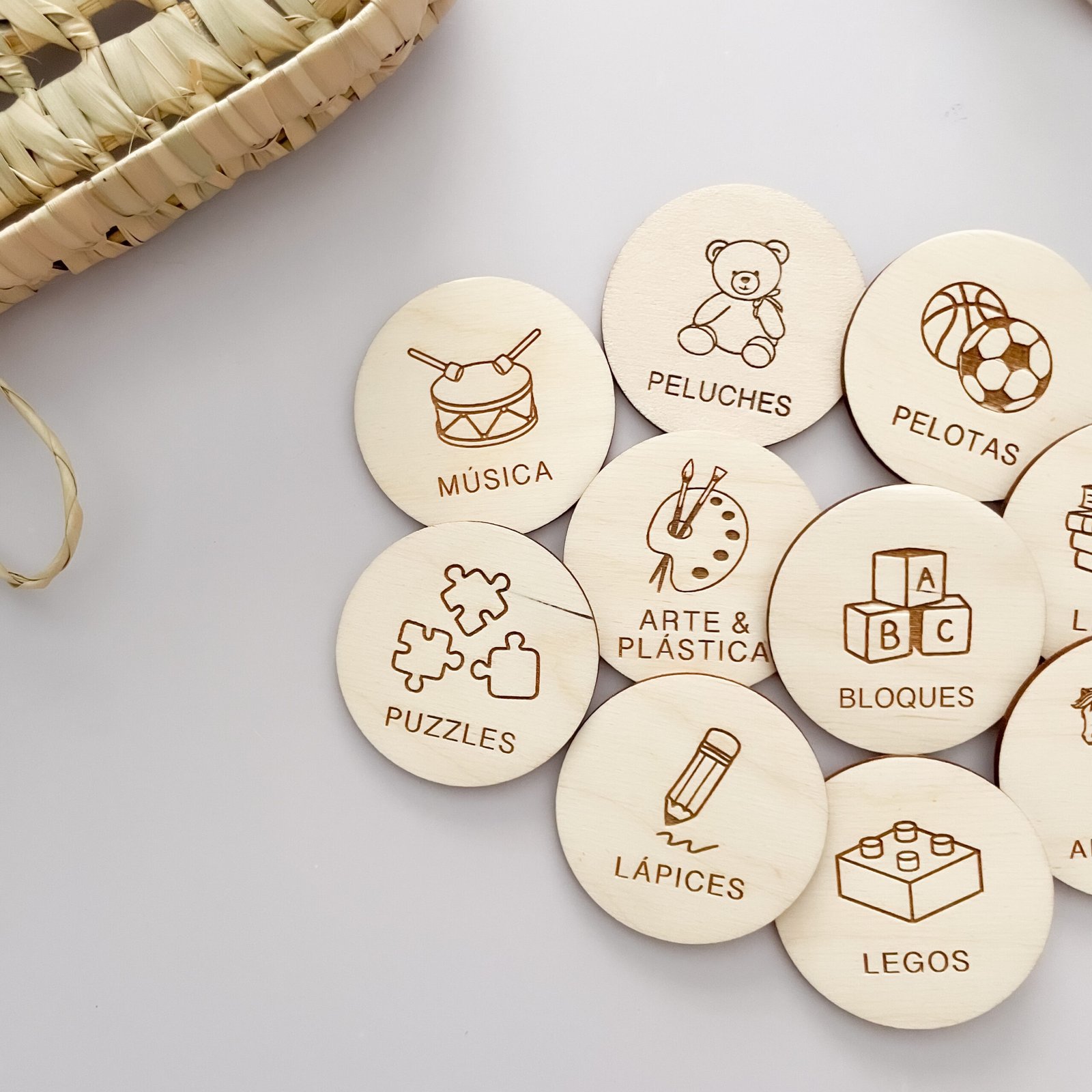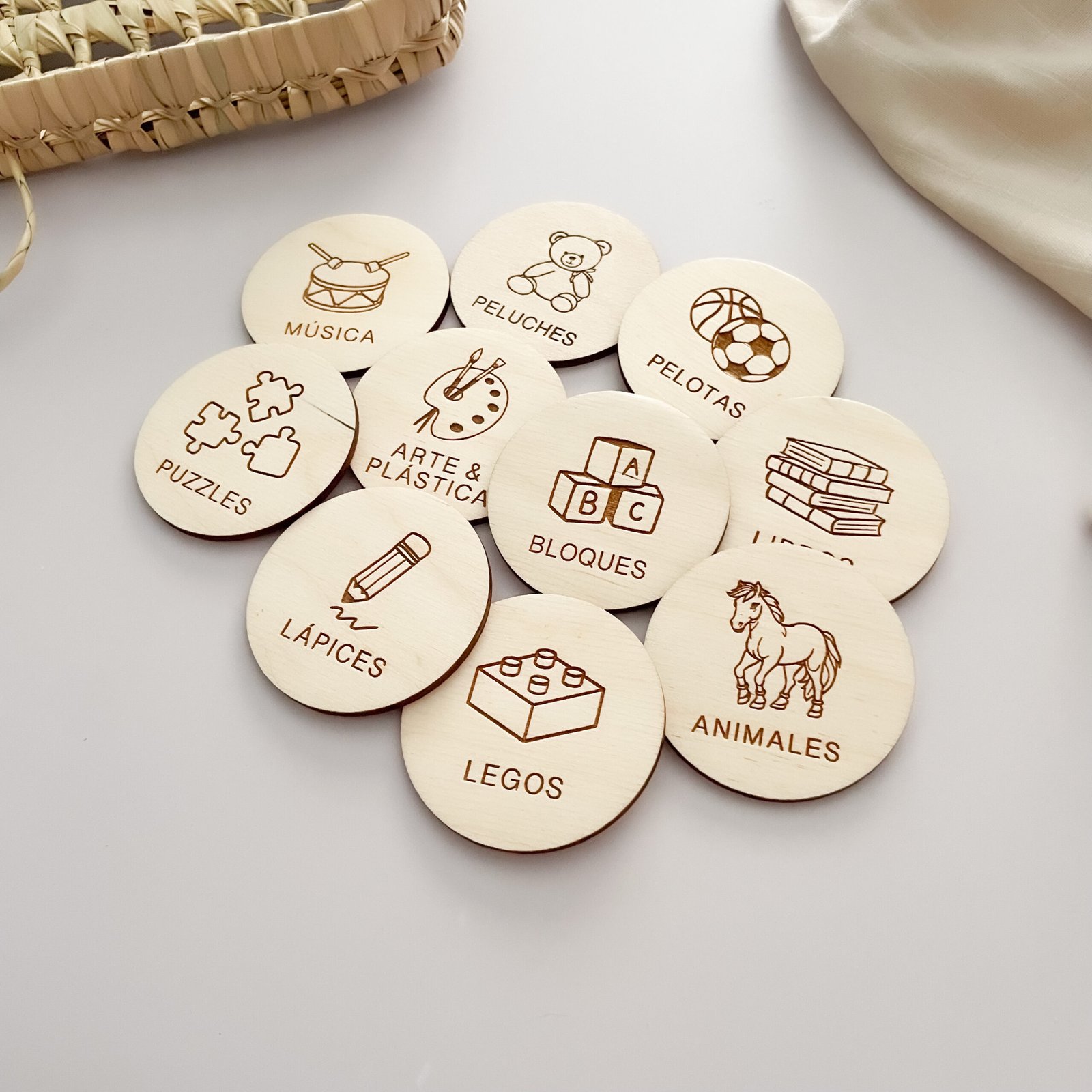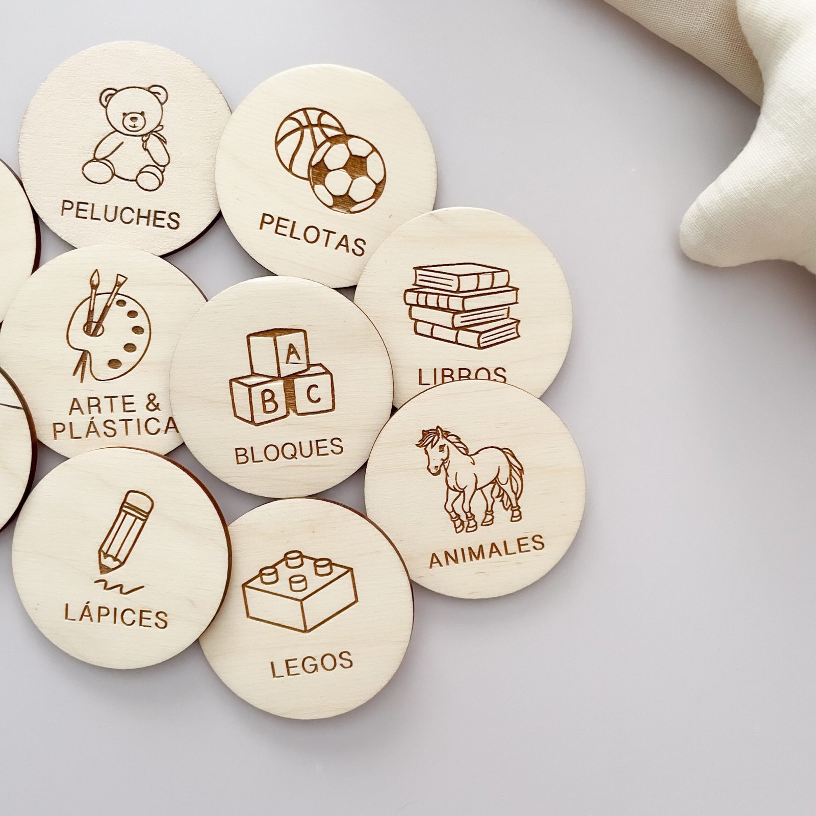 Etiquetas de madera para organizar los juguetes de los más pequeños de la casa por categorías o usos.