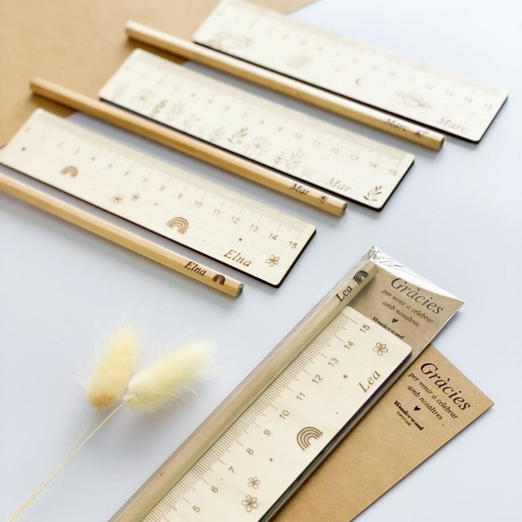 Descubre nuestro pack regla+lápiz de madera personalizados para regalar a los invitados del cumpleaños de tus peques.