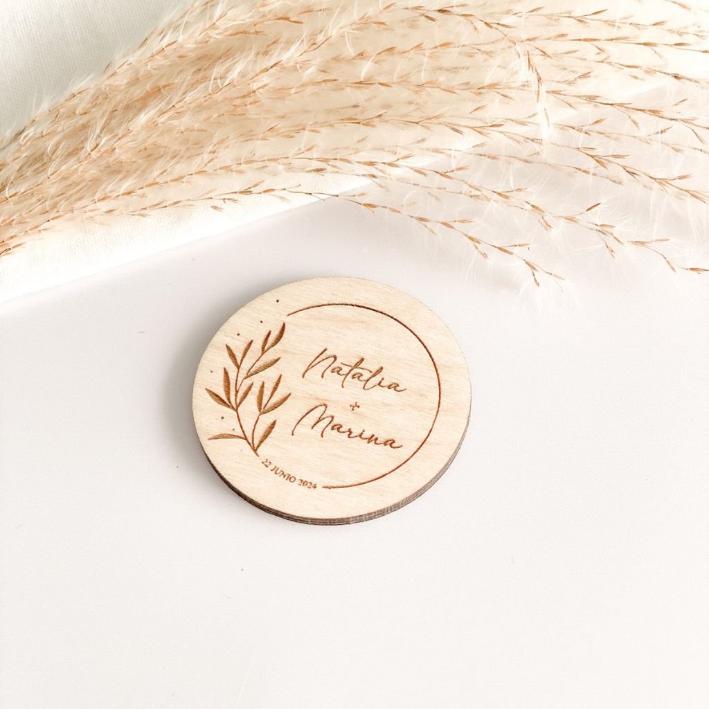 Preciosas placas de madera decorativas con un detalle floral de olivo para regalar a los invitados más pequeños del evento.