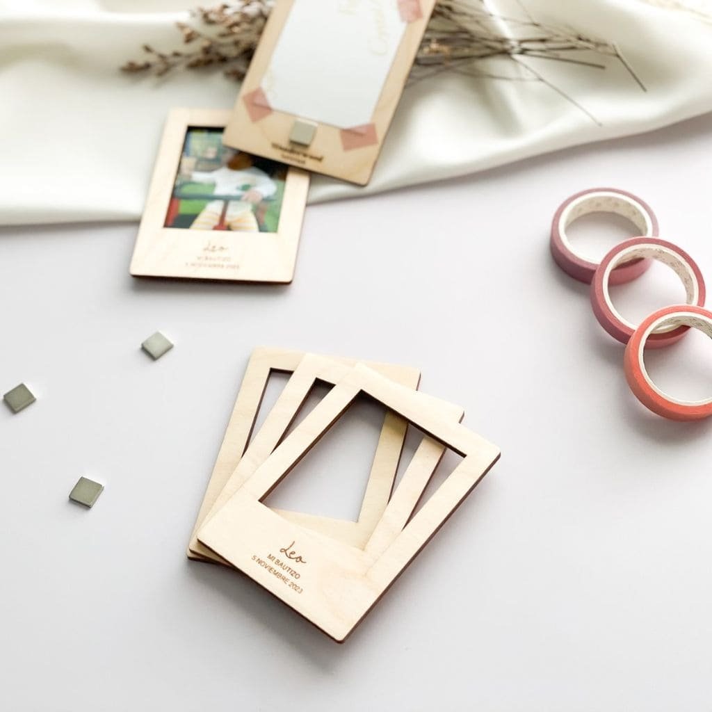 Portafotos de madera natural con imán para regalar a los invitados del bautizo de tu peque.