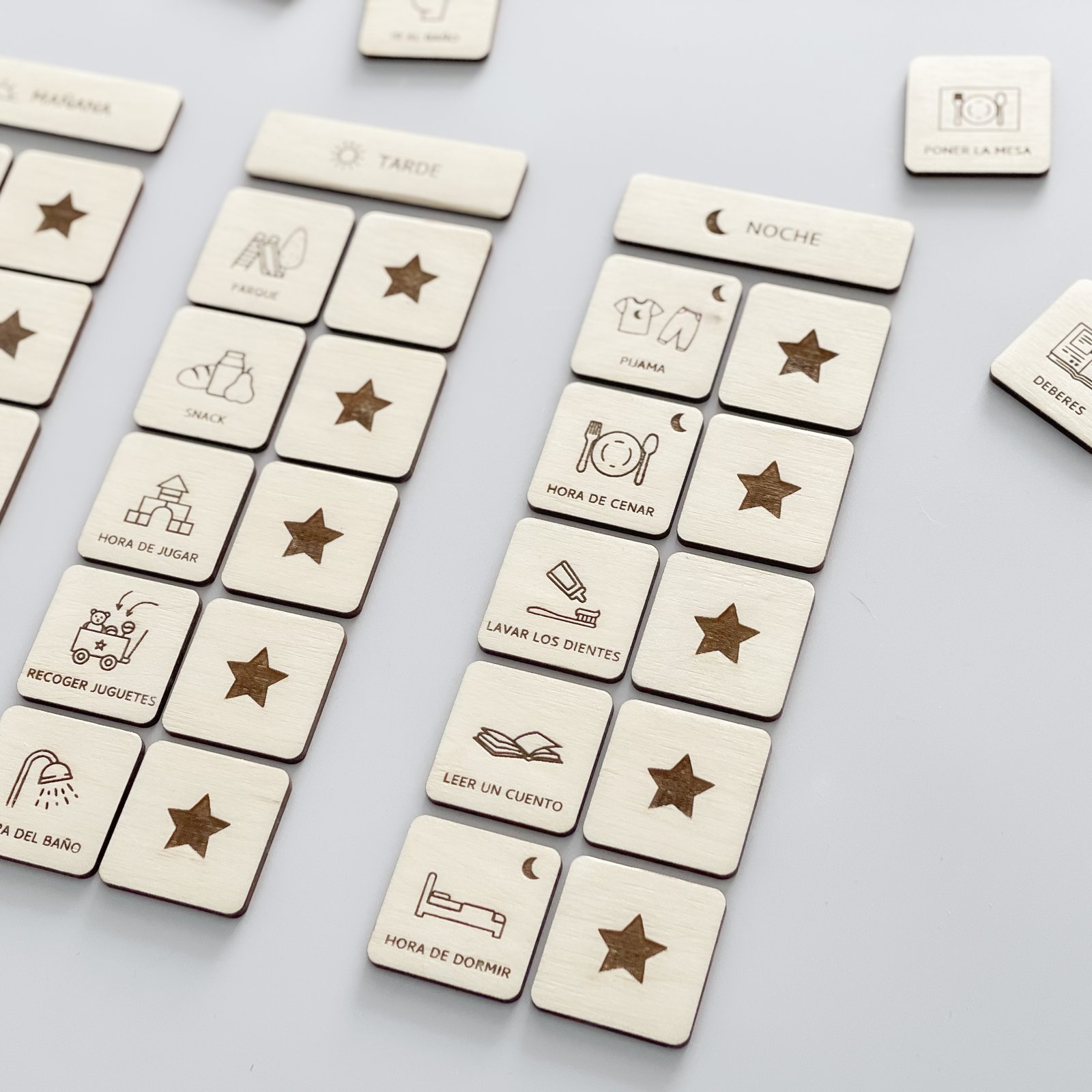 24 piezas de madera imantadas con rutinas: Desde levantarse hasta la hora de dormir, cada pieza representa una rutina clave para el día a día de tus pequeños.