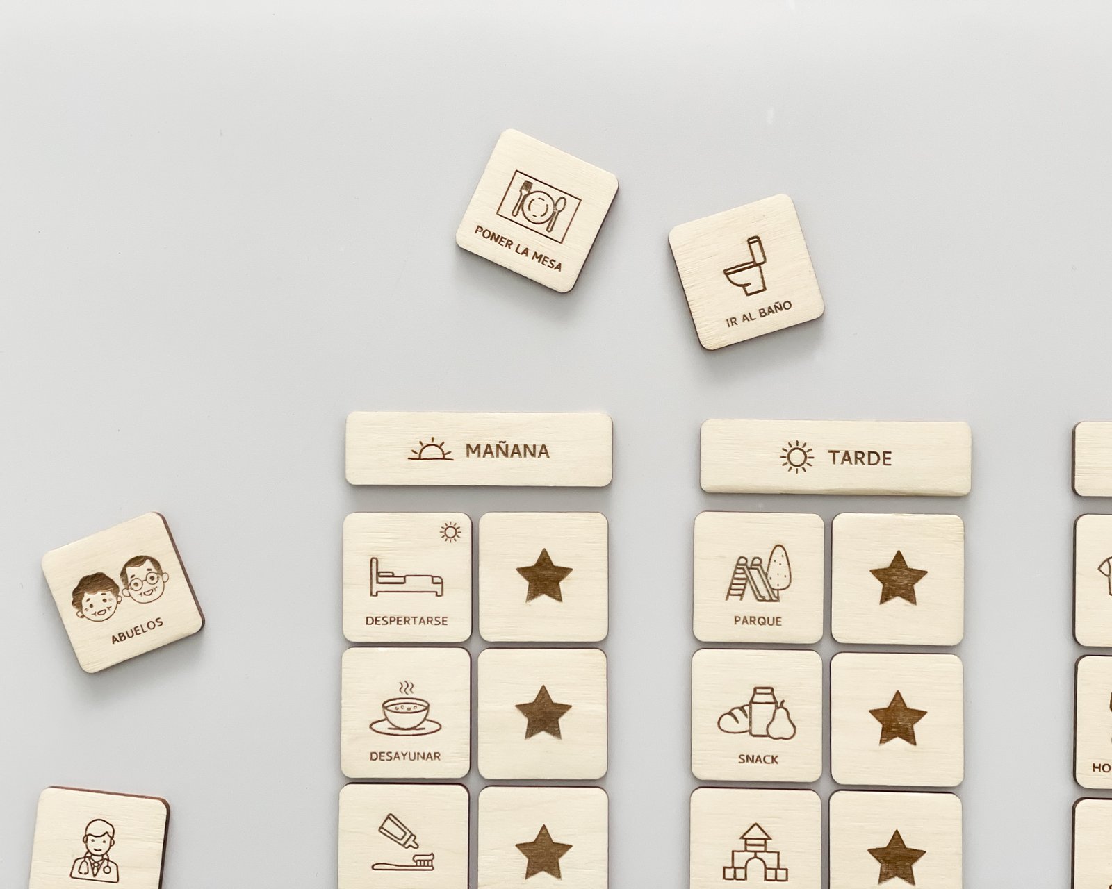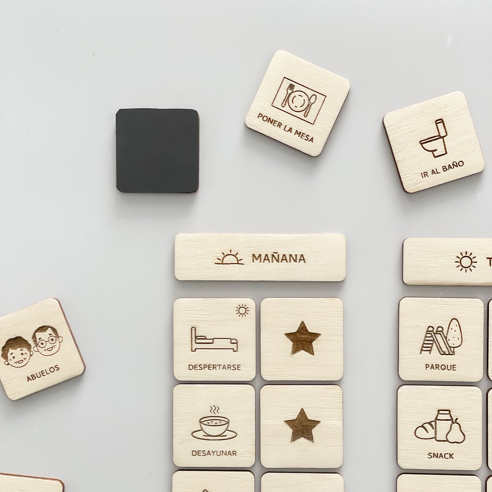 3 piezas de madera imantadas: “mañana”, “tarde” y “noche” y sus símbolos asociados: para poder aterrizar las rutinas en un horario comprensible para ellos.