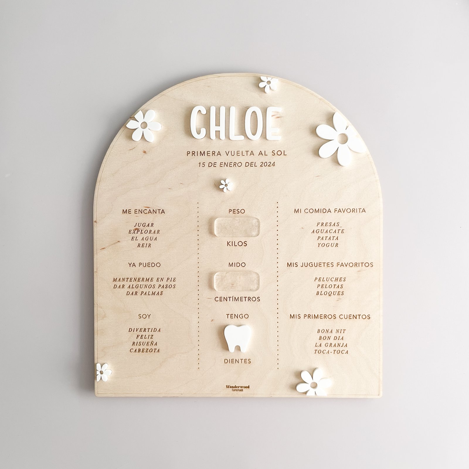 Tabla de madera grabada con los hitos del primer año del bebé y detalles en metacrilato blanco, que le aporta luminosidad al acabado.